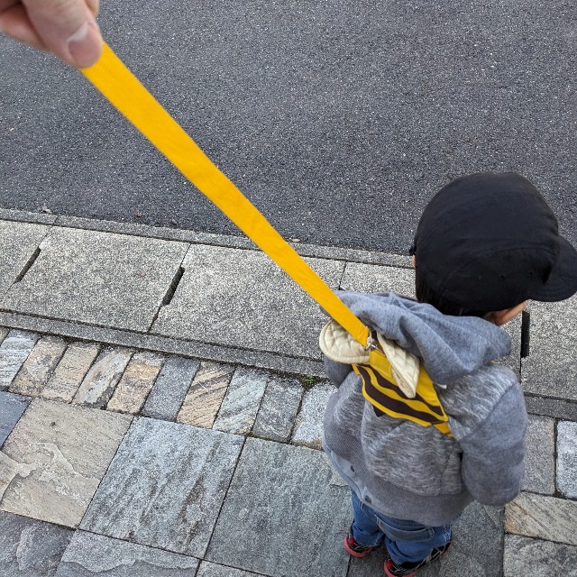 これもう本当にお疲れ様ですというか可哀そうというか誰かベビーカー引いていってやれよ案件だと思うんですが、ベビーカーとハーネスを併用して2人の子供を連れて移動する場合は、自分のリュックかなんかに着けて、ハーネスの高さを確保するのが正解だと思います。